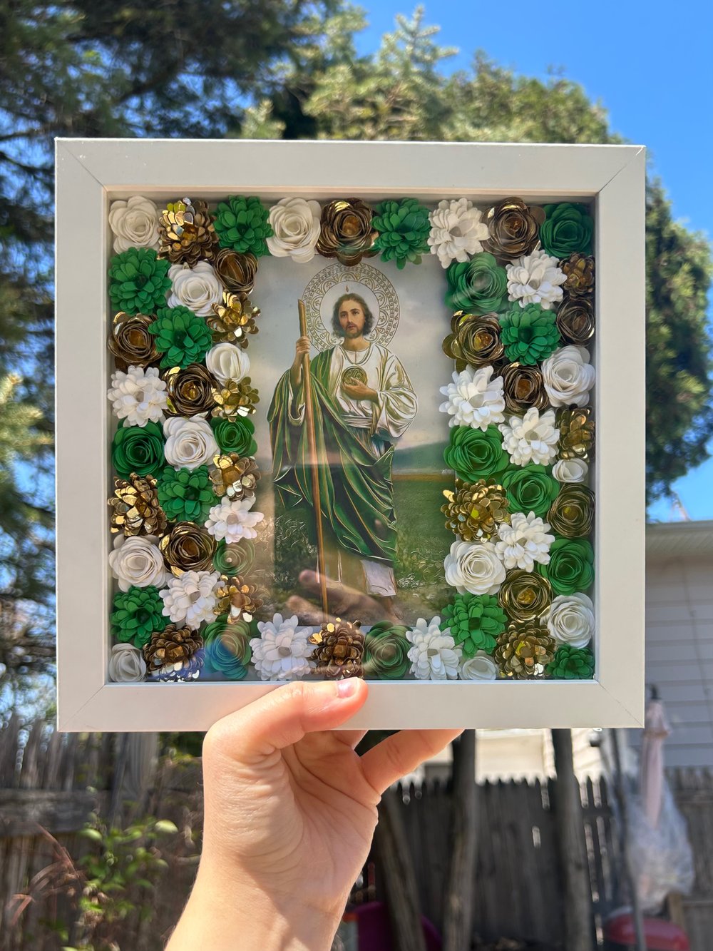 our san judas tadeo box, two different designs available san judas design with 4 big gold flowers (picture 1,2) or san judas design small mixed flowers (picture 3,4) all shadow boxes are 8" x 8"